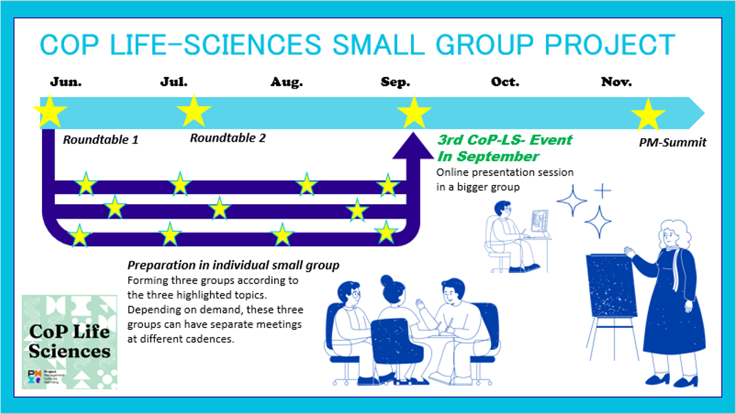 Kürzlich haben wir in der CoP Life Sciences eine neue Initiative gestartet, um in drei Arbeitsgruppen aktuelle Themen von großem Interesse zu bearbeiten: Projektmanagement in Produktentwicklung, Agile und KI. Die Ergebnisse aus den Arbeitsgruppen sollen innerhalb von ca. 3 Monaten in unterschiedlichen Formen wie Artikeln oder Präsentationen veröffentlicht werden. Die Arbeitsgruppen treffen sich nach Bedarf in unterschiedlichen Zeitabständen. Auch euer Beitrag ist herzlich willkommen. Mitarbeit in den Arbeitsgruppen unserer CoP Life Sciences bietet viele Vorteile für alle Teilnehmer, u. a. eine offene Lernkultur sowie der Wissenserwerb und -austausch von aktuellen Projektmanagement Inhalten, die sich in der Praxis und in der interdisziplinären Zusammenarbeit direkt anwenden lassen. Komm und sei Teil unserer CoP Life Sciences! Wir laden dich herzlich zu unseren Aktivitäten ein.